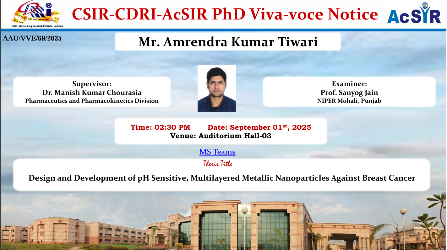 The Pharmaceutics and Pharmacokinetics Division at CSIR-Central Drug Research Institute (CDRI), Lucknow, plays a critical role in translating new chemical entities (NCEs), natural products, and repurposed drugs into viable therapeutic candidates. The division is at the forefront of preclinical drug development, focusing on quality control and establishing pharmaceutical specifications of CDRI molecules, formulation development, drug delivery systems, and pharmacokinetic profiling that ensure efficacy, safety, and patient compliance.